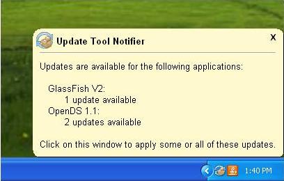 At the end of each update check interval if pending updates exist a balloon shaped notification window will appear on the desktop. The balloon notification is placed close to the notifier icon in the tasktray. On some platforms it may be difficult to determine the location of the icon in the tasktray. In those cases the balloon notification will default to a reasonable location on the desktop, for example the upper left corner or lower right corner.