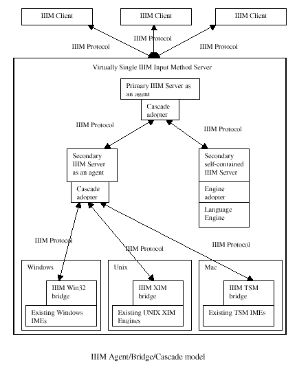 The IIIM Bridge is a pseudo IM client module that uses existing platform specific proprietary IMSPIs to leverage existing platform engines. This is done without requiring extensive modifications to the existing engines: